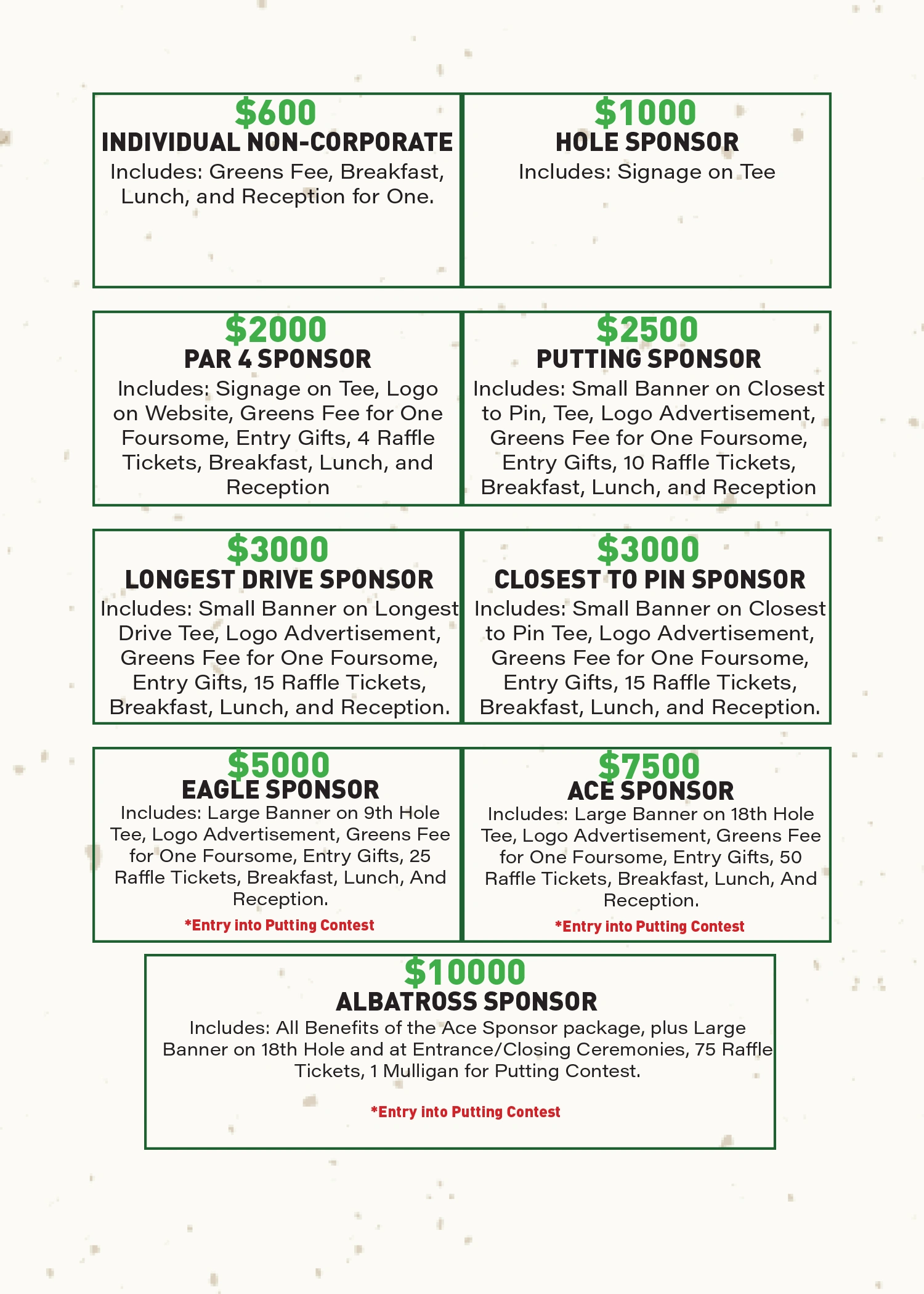 We’ll also continue our popular putting contest, with a special grand prize announcement coming soon. Sponsorship opportunities—including Eagle, Ace, and Albatross packages—offer fantastic ways to showcase your support while gaining visibility for your business or organization.